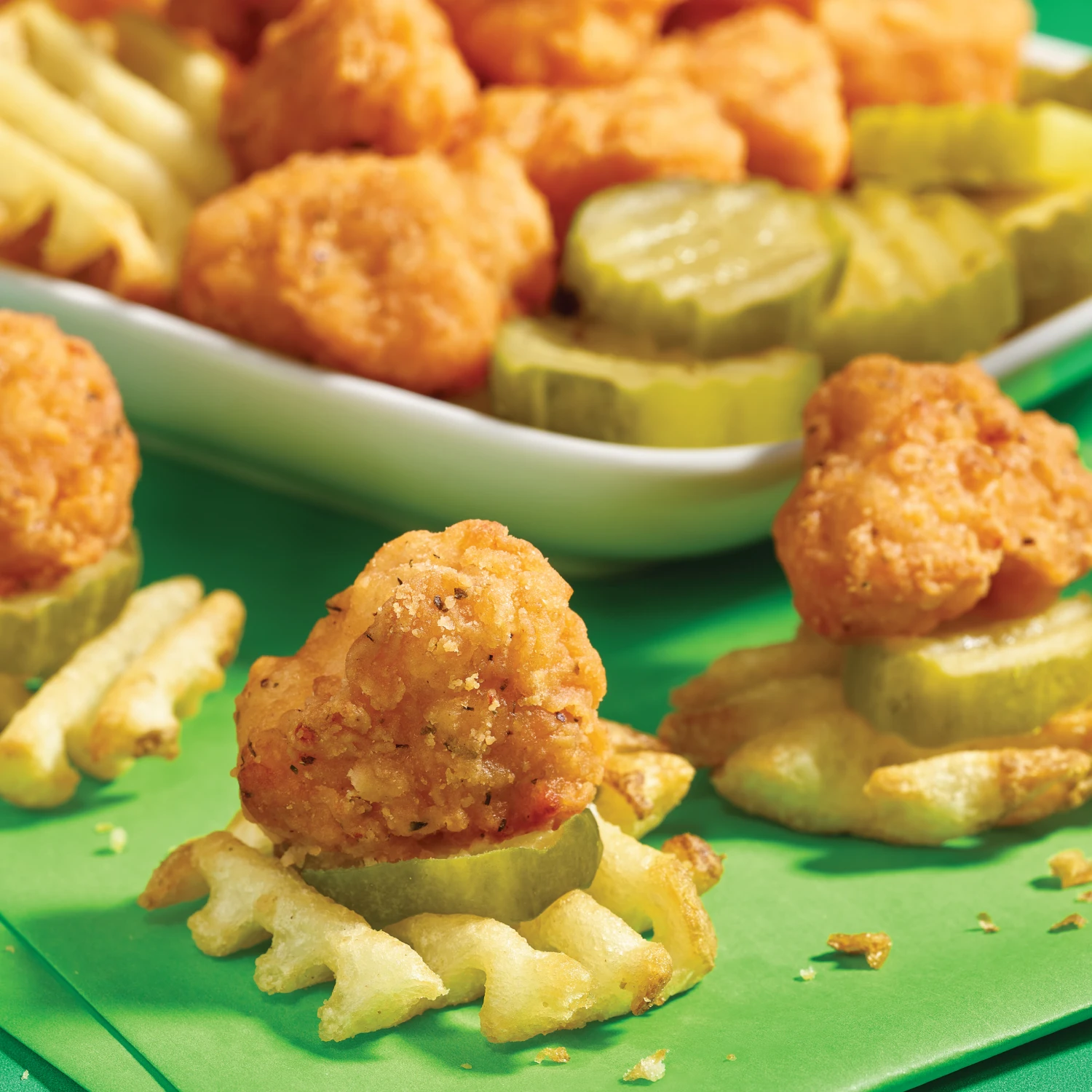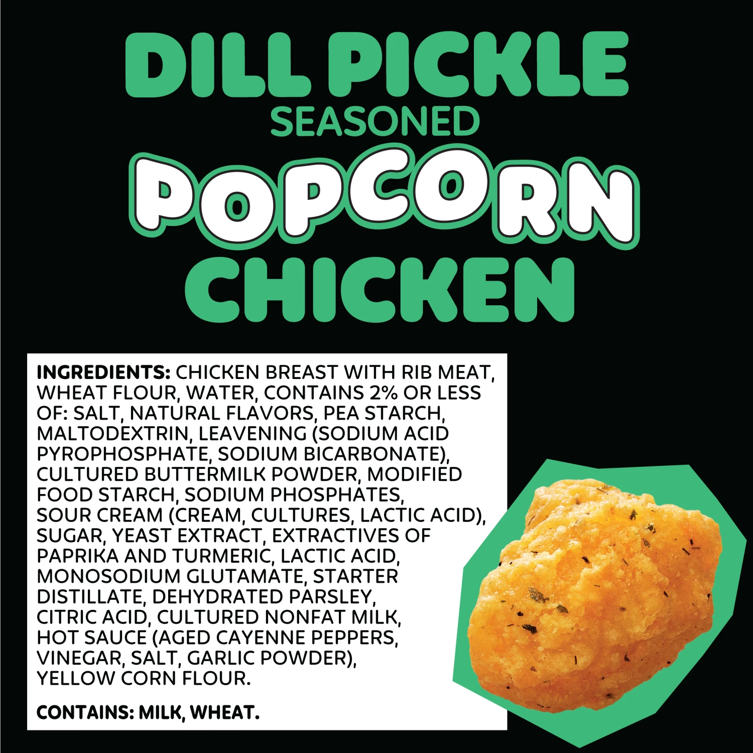 Crispy. Tangy. Totally addictive. This popcorn chicken packs a little zip in each bite. Seasoned with our special dill pickle blend to make for a bright, briny kick that will keep you reaching for more. Ready in minutes and will disappear just as fast! Get ready to dill-light your tastebuds with Dill Pickle Seasoned Popcorn Chicken.