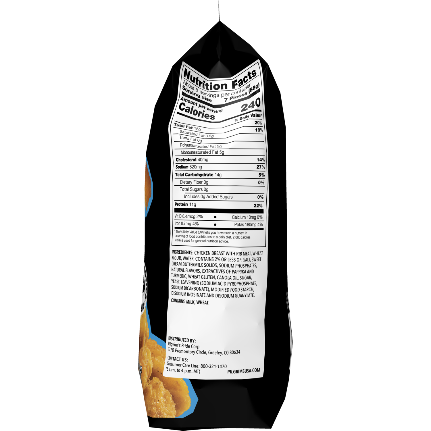 CHICKEN BREAST WITH RIB MEAT, WHEAT FLOUR, WATER, CONTAINS 2% OR LESS OF SEA SALT, SALT, SWEET CREAM BUTTERMILK SOLIDS, NATURAL FLAVOR, SODIUM PHOSPHATES, WHEAT GLUTEN, EXTRACTIVES OF PAPRIKA, CANOLA OIL, EXTRACTIVE OF TURMERIC, NATURAL CANE SUGAR, YEAST, LEAVENING (SODIUM ACID PYROPHOSPHATE, SODIUM BICARBONATE), MODIFIED FOOD STARCH, DISODIUM INOSINATE AND DISODIUM GUANYLATE. Contains: Milk, Wheat