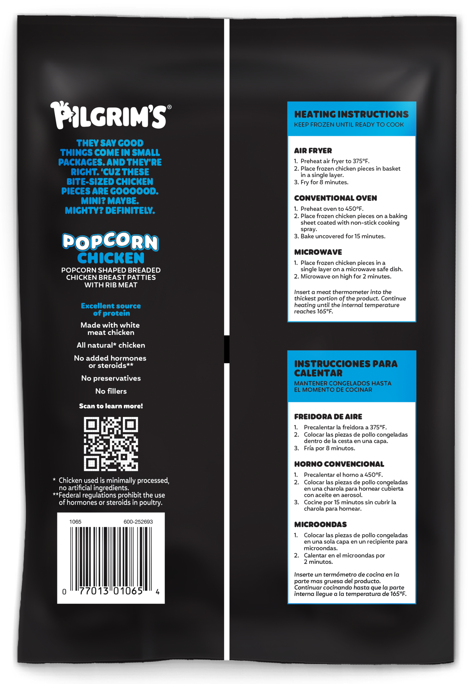 Don’t let their size fool you; this bite sized Pilgrim’s Popcorn Chicken is bursting with deliciousness and packed with a flavorful punch. Perfectly sized for snacking or party platters. Dunk it, Dip it, Devour it. The choice is yours.